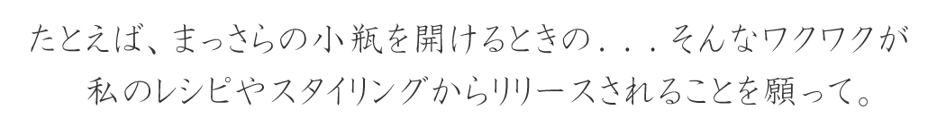 大手百貨店のサービス教育研修企画トレーナーとして勤務。 ル・コルドン・ブルー神戸校にて、料理、製菓、製パンを学ぶ。 フランス料理の技術やエスプリの効いた感性を学ぶ傍ら、 日本文化や日本料理の素晴らしさを再認識する。 その後、ミシュランガイド星獲得店 大阪心斎橋「味吉兆」 元料理長 清水義隆氏(現「味所望」店主)に師事。 技術だけでなく、盛り付け、器、旬など和食の心を教わる。 現在は、広告業界・出版業界のフードスタイリストの活動に重点を置きながら、 メニュー提案、レシピ開発もできるフードコーディネーターとして活躍中。 ニーズとトレンドを見極めたメニュー提案を得意とする。 また、子どもの施設へのメニュー提供など、食育の分野にも力を注いでいる。 東京・日本橋の自宅アトリエにて料理教室『食のアトリエ リリース』を主宰。 | |
